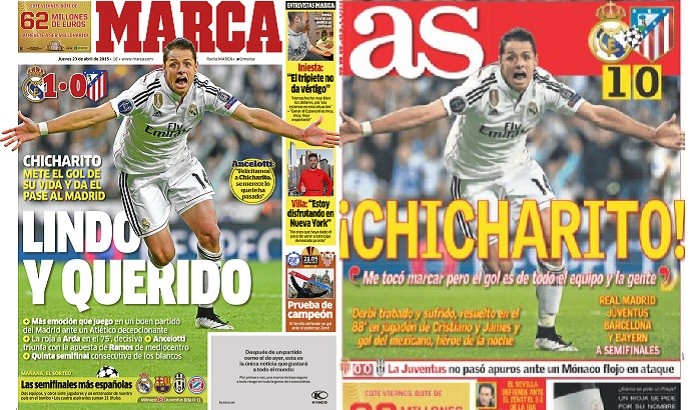 A lesão de Benzema alçou Javier Hernández de reserva pouco utilizado a titular em um duelo decisivo para o Real Madrid na Liga dos Campeões. O mexicano demorou, mas conseguiu fazer a diferença marcando o gol da vitória sobre o Atlético, por 1 a 0, aos 43 minutos do segundo tempo, após grande jogada de Cristiano Ronaldo, e, por isso, ganhou as capas de jornais de Madri nesta quinta-feira. Enquanto o "As" apenas traz o apelido do jogador, "Chicharito!", como manchete, o "Marca" exalta o carisma do latino, que já havia marcado gols decisivos no Manchester United: "Lindo e querido", diz o diário, que afirma que o atacante marcou "o gol de sua vida".