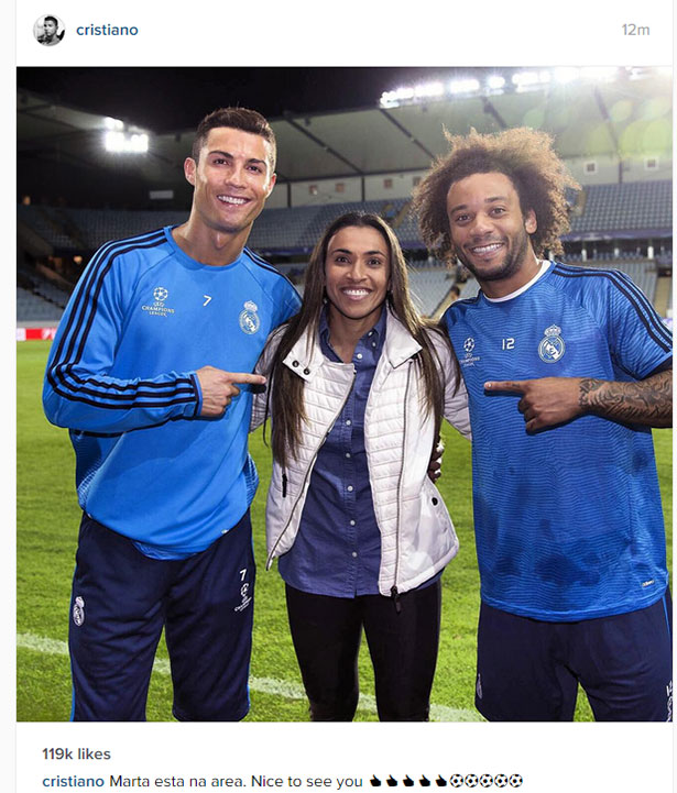 O atacante português Cristiano Ronaldo tietou a brasileira Marta no treino do Real Madrid nesta terça-feira. O craque postou uma foto ao lado da jogadora.